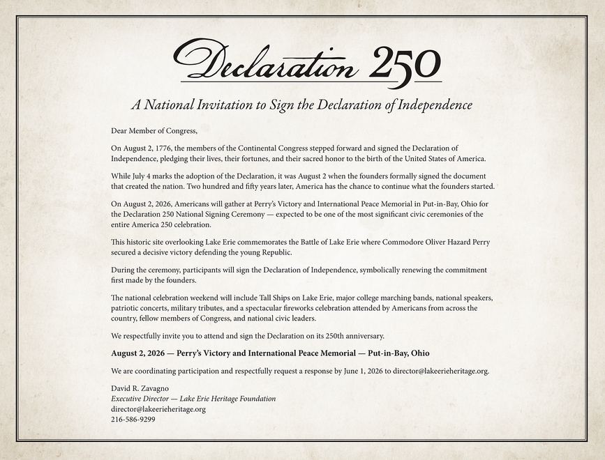The Lake Erie Heritage Foundation, a 501(c)(3) nonprofit, has organized Declaration 250 — a National Signing Ceremony at Perry's Victory and International Peace Memorial on Put-in-Bay, Ohio. This is the official America 250 event honoring August 2nd, with national speakers, live performances, military ceremonies, and a moment the country will not forget.